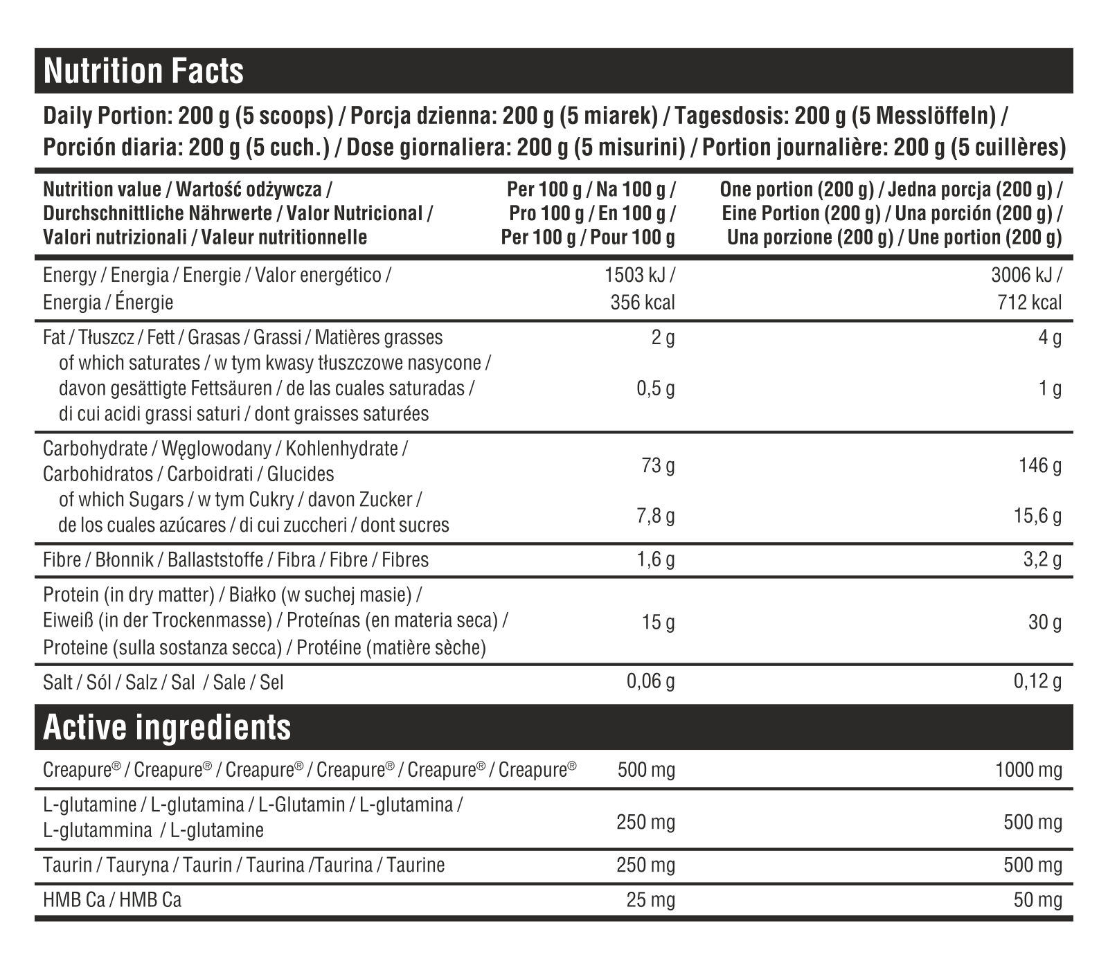 Koolhydraat-eiwitvoeding op basis van gehydrolyseerd maïszetmeel en havermoutmeel. Het product is verrijkt met wei-eiwitconcentraat, melkeiwitconcentraat, HMB-Ca en een toevoeging van creatine monohydraat (Creapure®), glutamine en taurine.