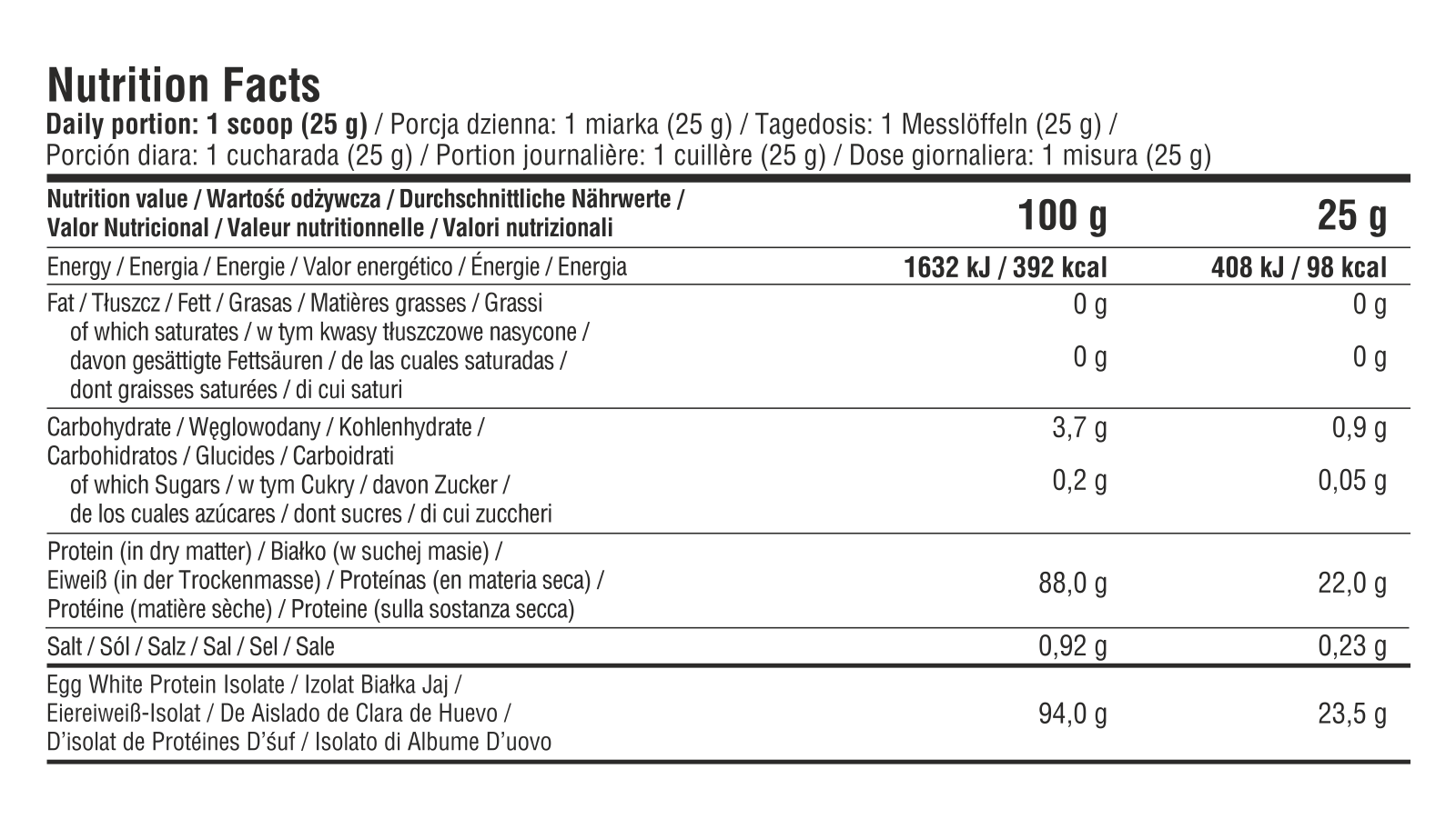 INGREDIËNTEN: 94% ei-eiwitisolaat; aroma; emulgator: lecithine* (*uit zonnebloempitten); zoetstof: sucralose.