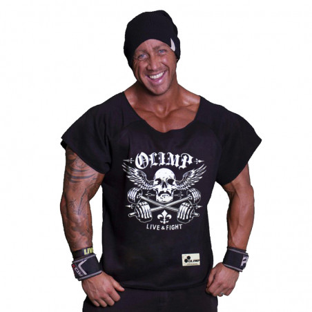 Rag Top, gemaakt van 100% katoen met speciale vezels om het sporten te vergemakkelijken. Bedrukt met het iconische OLIMP LIVE & FIGHT-schedellogo met barbells op de borst. Raglanmouwen, ongestikte randen.
